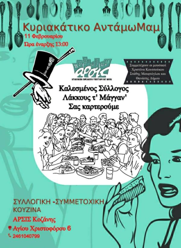 Η ομάδα της Συλλογικής Κουζίνας, σας καλεί στο Κυριακάτικο Αντάμωμαμ που θα πραγματοποιηθεί 11 Φεβρουαρίου, 13:00, στο σπίτι της ΑΡΣΙΣ Κοζάνης, για να μοιραστούμε μια όμορφη συλλογική εμπειρία, να απολαύσουμε το φαγητό με παρέα, να κάνουμε την Κυριακή μας πιο όμορφη!!!