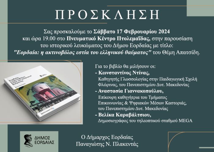 Παρουσίαση ιστορικού λευκώματος Δήμου Εορδαίας με τίτλο «Εορδαία: η ακτινοβόλος εστία του ελληνικού θαύματος» του Θέμη Απατσίδη