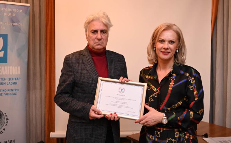 Ιδιαίτερα σημαντική ήταν η στιγμή της ανακοίνωσης από τον Γενικό Πρόξενο ότι το Τμήμα εκμάθησης της ελληνικής γλώσσας της Πελαγονίας αναγνωρίζεται πλέον από το Υπουργείο Παιδείας, Θρησκευμάτων και Αθλητισμού ως Τμήμα Ελληνικής Γλώσσας. Η αναγνώριση αυτή ήρθε ως αποτέλεσμα των συντονισμένων ενεργειών και του Γενικού Προξένου με τον κ. Ρίστοβσκι και τον υπεύθυνο του εξεταστικού κέντρου για την οργάνωση και υλοποίηση των μαθημάτων, τη γλωσσική, πολιτιστική και ακαδημαϊκή συνεργασία, κ. Κρίστιαν Βελιάνοβ.