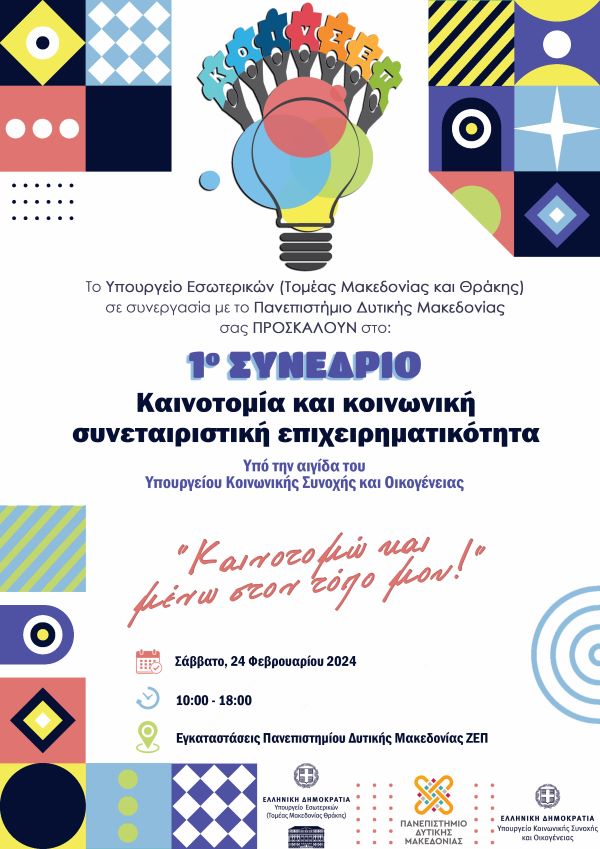 Το Πανεπιστήμιο Δυτικής Μακεδονίας σε συνεργασία με το Υπουργείο Μακεδονίας Θράκης διοργανώνουν το 1ο Συνέδριο, με τίτλο “Καινοτομία και κοινωνική συνεταιριστική επιχειρηματικότητα – Καινοτομώ και μένω στον τόπο μου”. Το Συνέδριο θα πραγματοποιηθεί στις 24 Φεβρουαρίου 2024, στο αμφιθέατρο του Κτηρίου Διοίκησης, στην Πανεπιστημιούπολη, στη ΖΕΠ Κοζάνης.