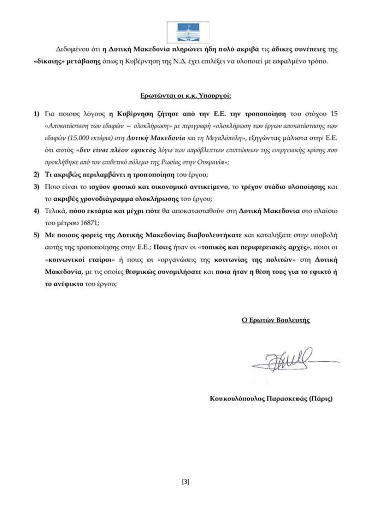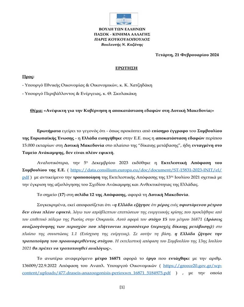 Απαντήσεις για το έργο αποκατάστασης εδαφών στη Δυτική Μακεδονία, που έχει ενταχθεί στο Ταμείο Ανάκαμψης και Ανθεκτικότητας, ζητά από την Κυβέρνηση ο Βουλευτής Κοζάνης και Υπεύθυνος ΚΤΕ Οικονομικών του ΠΑΣΟΚ – Κινήματος Αλλαγής, Πάρις Κουκουλόπουλος.