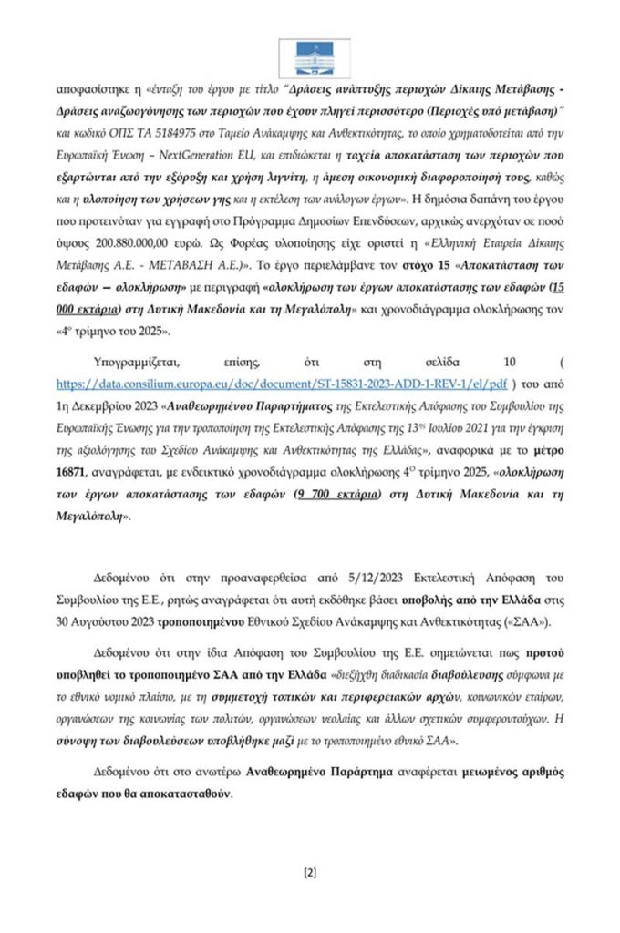 Επιπλέον, ο Βουλευτής του ΠΑΣΟΚ υπογραμμίζει πως στο Αναθεωρημένο Παράρτημα της Απόφασης το έργο αναφέρεται με μειωμένο αντικείμενο, ως «ολοκλήρωση των έργων αποκατάστασης των εδαφών (9 700 εκτάρια) στη Δυτική Μακεδονία και τη Μεγαλόπολη».