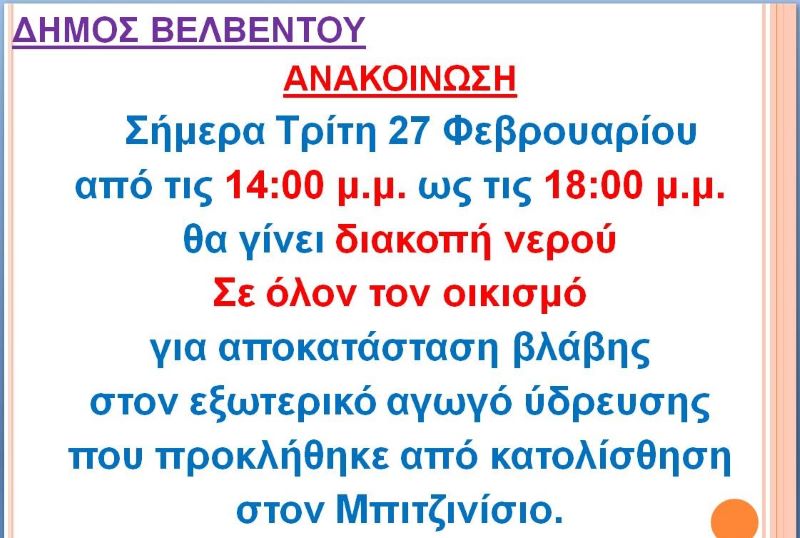 Σέρβια - Βελβεντό 27/02/2024 Δήμος Βελβεντού: Διακοπή νερού σε όλο τον οικισμό σήμερα Τρίτη 27 Φεβρουαρίου 0 Διακοπή νερού σε όλο τον οικισμό από τις 14:00 – 18:00 σήμερα Τρίτη 27 Φεβρουαρίου, για αποκατάσταση βλάβης στον εξωτερικό αγωγό ύδρευσης.