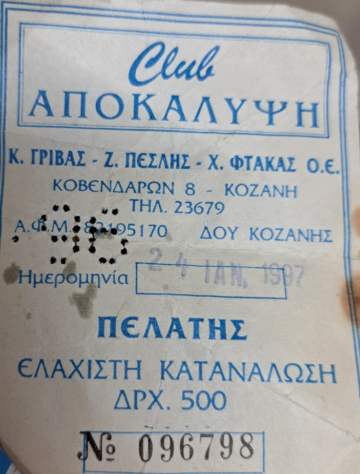 Η απόδειξη του 1997 από το “θρυλικό” Club της πόλης,  αλιεύτηκε από την ομάδα του Facebbok, Κοζάνη, Μνήμες, Αναμνήσεις & Εικόνες .