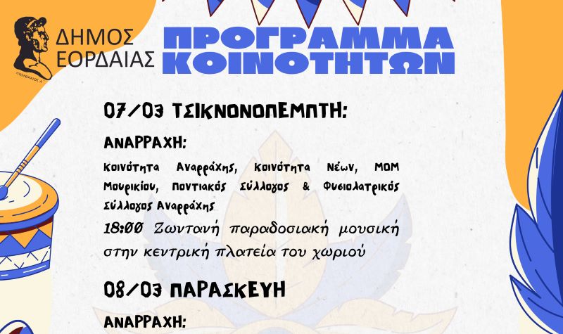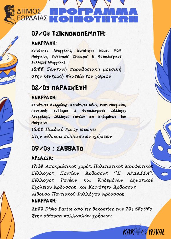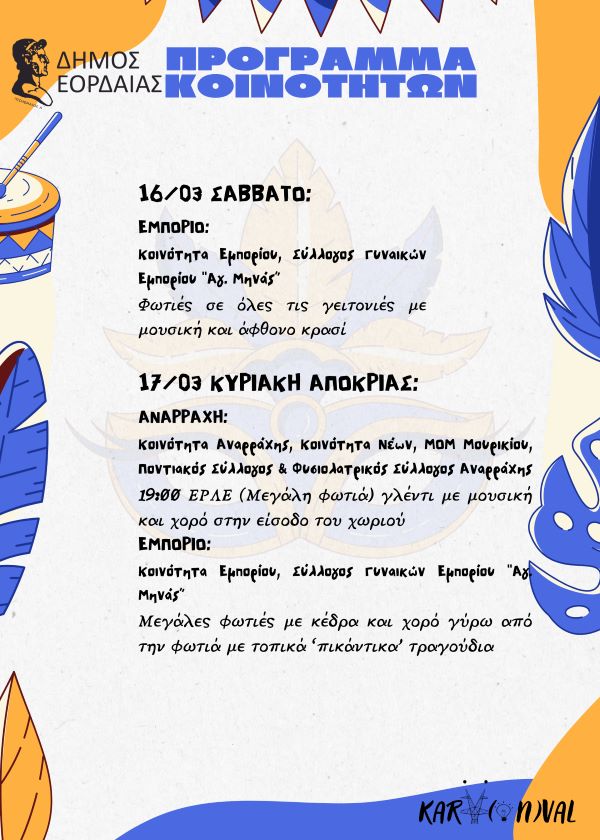 Ο παλμός του καρναβαλιού χτυπά δυνατά στην Εορδαία και προσκαλεί μικρούς και μεγάλους να γίνουν μέρος της μεγάλης γιορτής της Αποκριάς και των εθίμων της Καθαράς Δευτέρας, με 74 εκδηλώσεις που διοργανώνουν 65 φορείς μαζί με τον Δήμο Εορδαίας, όπως σχολεία Α’,Β’/θμιας, ΚΔΑΠ, Πολιτιστικοί και Αθλητικοί Σύλλογοι, Κοινότητες και επιχειρηματίες της πόλης.