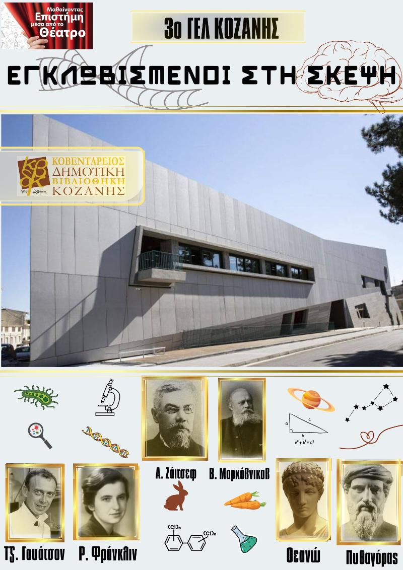 Οι μαθητές/-τριες του 3ου ΓΕΛ Κοζάνης συμμετέχουν και φέτος στο θεατρικό φεστιβάλ «ΜΑΘΑΙΝΟΝΤΑΣ ΕΠΙΣΤΗΜΗ ΜΕΣΑ ΑΠΟ ΤΟ ΘΕΑΤΡΟ (2023-2024)», με δύο θεατρικά έργα που συνδυάζουν επιστήμη και θέατρο, παρουσιάζοντας επιστήμονες και επιστημονικά επιτεύγματα μέσα από τον θεατρικό λόγο, το χιούμορ και τη φαντασία των εφήβων.