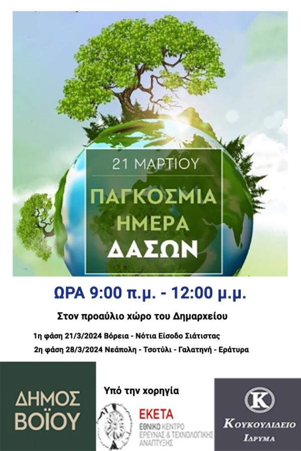 O Δήμος Βοΐου διοργανώνει δράσεις ευαισθητοποίησης με αφορμή την Παγκόσμια Ημέρα Δασοπονίας την Πέμπτη 21 Μαρτίου 2024 στις 10.00 πμ στον προαύλειο χώρο του Δημαρχείου, πλατεία Τσιστοπούλου, στη δημοτική ενότητα Σιάτιστας με τη συμμετοχή μαθητών και μαθητριών των Δημοτικών Σχολείων Σιάτιστας και του Μουσικού Λυκείου Σιάτιστας. Θα ακολουθήσουν παρόμοιες δράσεις στις 28 Μαρτίου και ώρα 10:00 π.μ στη Νεάπολη, στο Τσοτύλι, στη Γαλατινή και στην Εράτυρα στους αύλειους χώρους των δημοτικών καταστημάτων.