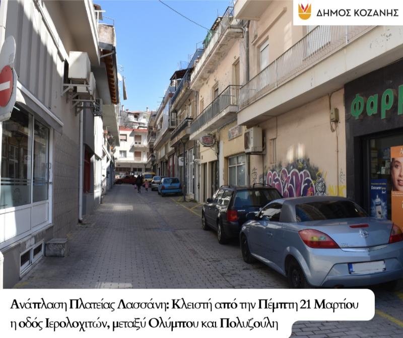 Ο Δήμος Κοζάνης ενημερώνει ότι από την Πέμπτη 21 Μαρτίου 2024, η οδός Ιερολοχιτών, που βρίσκεται μεταξύ των οδών Ολύμπου και Πολυζούλη, κλείνει λόγω των εν εξελίξει εργασιών ανάπλασης της πλατείας Λασσάνη.