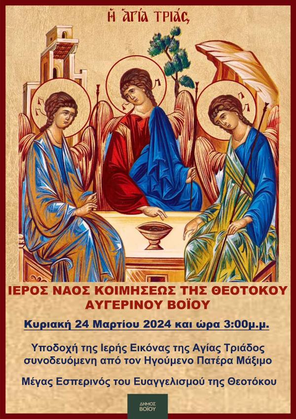 Βόιο 22/03/2024 Υποδοχή της Ιερής Εικόνας της Αγίας Τριάδος στον Ιερό Ναό Κοιμήσεως της Θεοτόκου στον Αυγερινό Βοΐου 0 Υποδοχή της Ιερής Εικόνας της Αγίας Τριάδος στον Ιερό Ναό Κοιμήσεως της Θεοτόκου στον Αυγερινό Βοΐου, συνοδευόμενη από Ηγούμενο Πατέρα Μάξιμο, την Κυριακή 24 Μαρτίου 2024 και ώρα 3:00 μ.μ. Μέγας Εσπερινός του Ευαγγελισμού της Θεοτόκου.
