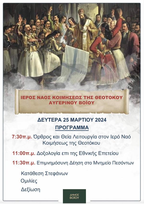 Βόιο 23/03/2024 Ο εορτασμός της 25ης Μαρτίου στον Αυγερινό Βοΐου 0 Ο εορτασμός της 25ης Μαρτίου στον Αυγερινό Βοΐου. 7:30π.μ. Όρθρος και Θεία Λειτουργία στον Ιερό Ναό Κοιμήσεως της Θεοτόκου 11:00π.μ. Δοξολογία 11:30π.μ. Επιμνημόσυνη Δέηση στο Μνημείο Πεσόντων Ακολουθούν κατάθεση στεφάνων, ομιλίες και δεξίωση.