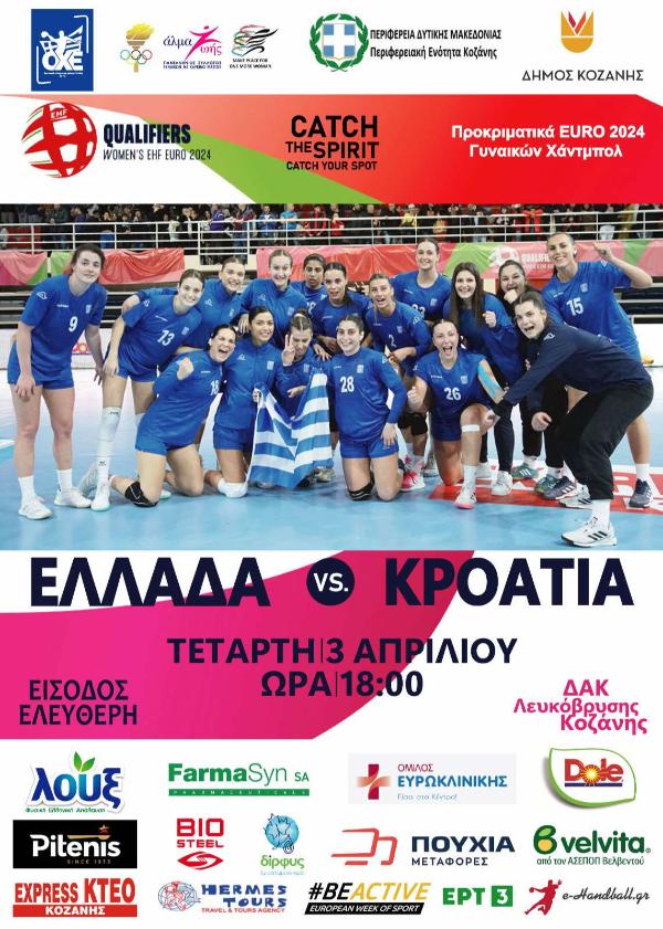 Ο Δήμος Κοζάνης, σε συνεργασία με την Περιφέρεια Δυτικής Μακεδονίας και την Ομοσπονδία Χειροσφαίρισης Ελλάδας (ΟΧΕ), καλεί το φίλαθλο κοινό να δώσει το δυναμικό του παρών στον κρίσιμο πανευρωπαϊκό αγώνα χάντμπολ Γυναικών μεταξύ των Εθνικών Ομάδων Ελλάδας-Κροατίας, για τη διεκδίκηση της πρόκρισης στα τελικά του EURO 2024, που θα γίνει την Τετάρτη 3 Απριλίου και ώρα 18:00 το απόγευμα στο Κλειστό Γυμναστήριο της Λευκόβρυσης, με ελεύθερη είσοδο για όλες και όλους.