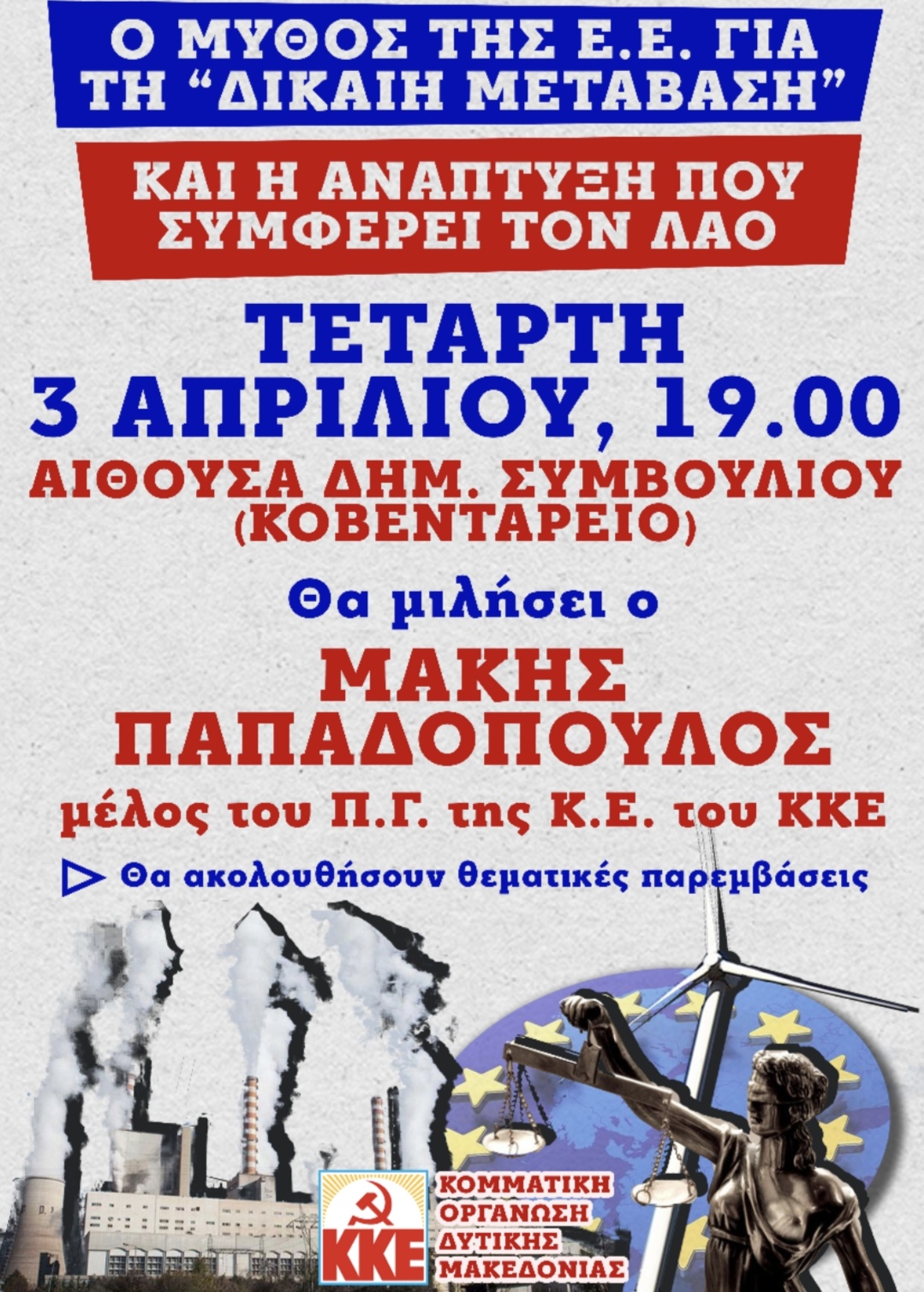 Η ΚΟ Δυτικής Μακεδονίας του ΚΚΕ θα πραγματοποιήσει την Τετάρτη 3 Απριλίου 2024 και ώρα 19:00, στην αίθουσα συνεδριάσεων του Δημοτικού Συμβουλίου Κοζάνης – Κοβεντάρειο, πολιτική εκδήλωση με θέμα: