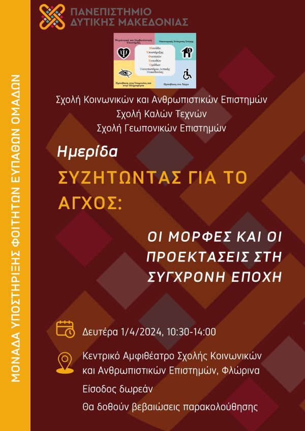 Η Μονάδα Υποστήριξης Φοιτητών Ευπαθών Ομάδων (ΜΥΦΕΟ) του Πανεπιστημίου Δυτικής Μακεδονίας διοργανώνει ημερίδα με θέμα: “Συζητώντας για το άγχος: Οι μορφές και οι προεκτάσεις του στη σύγχρονη εποχή”, τη Δευτέρα 1η Απριλίου 2024, στο κεντρικό Αμφιθέατρο της Σχολής Κοινωνικών και Ανθρωπιστικών Επιστημών στη Φλώρινα και ώρα 10:00. Η εν λόγω εκδήλωση συνδιοργανώνεται από τη Σχολή Κοινωνικών και Ανθρωπιστικών Επιστημών, τη Σχολή Γεωπονικών Επιστημών και τη Σχολή Καλών Τεχνών.