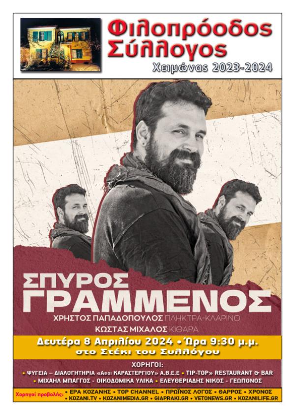 Ο Φιλοπρόοδος Σύλλογος Κοζάνης συνεχίζει να καταθέτει τις μουσικές του προτάσεις στη φετινή, ανοιξιάτικη πλέον περίοδο και αυτή τη φορά απευθύνεται στις νεότερες γενιές με τη μουσική παράσταση που έχει επιμεληθεί και παρουσιάζει ένας σύγχρονος και πολλά υποσχόμενος τραγουδοποιός, ο Σπύρος Γραμμένος.