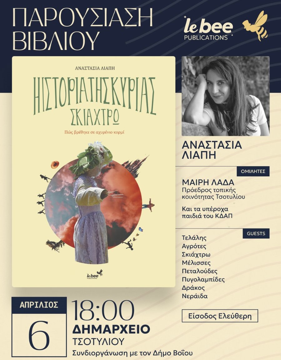 Παρουσίαση βιβλίου το Σάββατο 6 Απριλίου 2024 στις 18:00, στο Δημαρχείο Τσοτυλίου «Η ΙΣΤΟΡΙΑ ΤΗΣ ΚΥΡΙΑΣ ΣΚΙΑΧΤΡΩ Πώς βρέθηκε σε αχυρένιο κορμί» Της Αναστασίας Λιάπη
