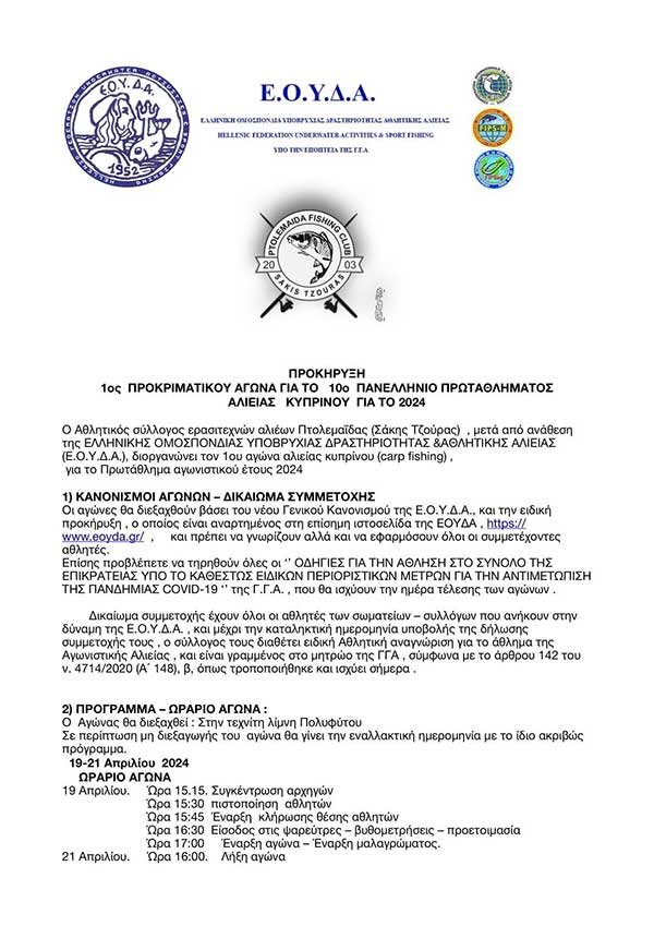Σέρβια - Βελβεντό 08/04/2024 Το 10ο Πανελλήνιο Πρωτάθλημα Αλιείας Κυπρίνου στη λίμνη Πολυφύτου στις 19-21/4 0