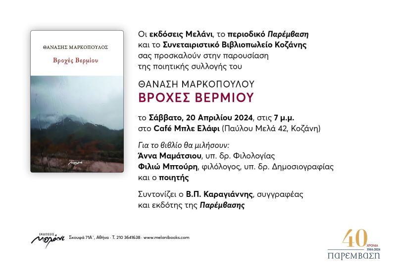 Παρουσίαση βιβλίου του Θανάση Μαρκόπουλου ‘Βροχές Βερμίου’ στις 20 Απριλίου στην Κοζάνη