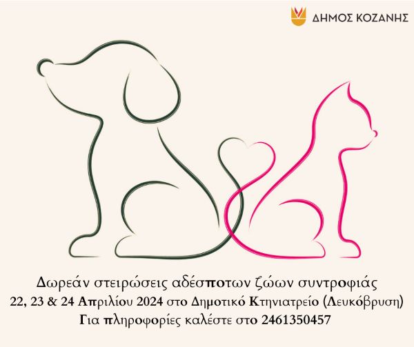 Μία ακόμη δράση με δωρεάν στειρώσεις αδέσποτων σκύλων και γατών από εθελοντές κτηνιάτρους υλοποιεί ο Δήμος Κοζάνης, στοχεύοντας στην ενίσχυση του ολοκληρωμένου προγράμματος διαχείρισης αδέσποτων ζώων συντροφιάς, που ήδη εκπονεί. Η δράση τελεί υπό την αιγίδα και την πλήρη υποστήριξη του Μη Κερδοσκοπικού Οργανισμού «Tierarzte-pool».