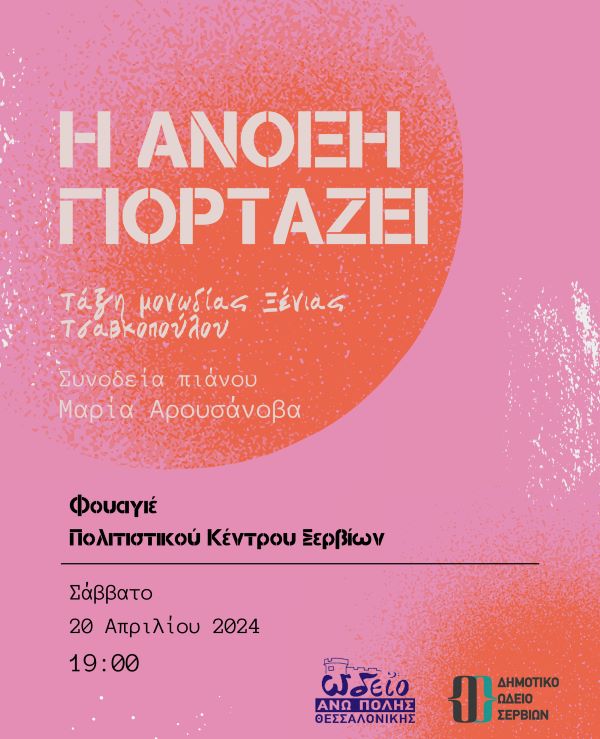 Το Δημοτικό Ωδείο Σερβίων και το Ωδείο Άνω Πόλης Θεσσαλονίκης παρουσιάζουν μια μουσική εκδήλωση που γιορτάζει την άφιξη της Άνοιξης υπό τον τίτλο «Η Άνοιξη γιορτάζει». Η συναυλία αυτή θα αποτελέσει μια ευκαιρία για τους ερμηνευτές να μοιραστούν το ταλέντο και την αγάπη τους για τη μουσική με το κοινό.