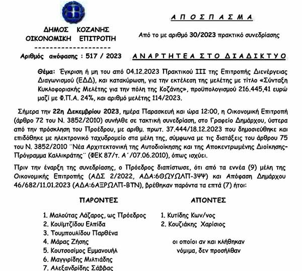 Θυμίζουμε πως η κατακύρωση της κυκλοφοριακής μελέτης στον ανάδοχο έγινε στο τέλος του 2023 από την Οικονομική Επιτροπή του Δήμου, με συνέπεια να υπογραφεί η σύμβαση και να ξεκινήσει η εκπόνησης της στις αρχές του 2024.