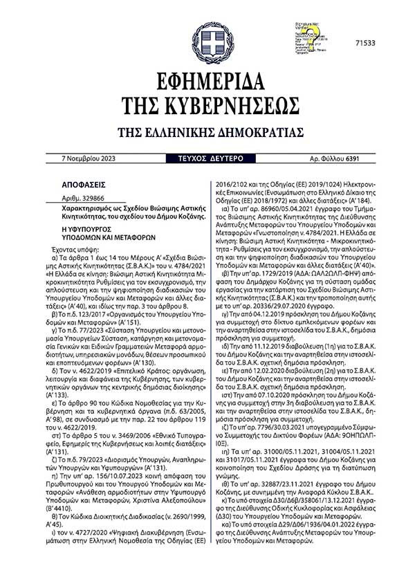Η δεύτερη εξέλιξη αφορά το Σχέδιο Βιώσιμης Αστικής Κινητικότητας (ΣΒΑΚ) του Δήμου Κοζάνης, το οποίο εγκρίθηκε και δημοσιεύθηκε στο ΦΕΚ τον Νοέμβριο του 2023. Είναι επομένως ώρα να ξεκινήσει η υλοποίησή του, είναι ώρα να αρχίσουν να υιοθετούνται οι προτάσεις που περιλαμβάνονται σε αυτό, ούτως ώστε οι μετακινήσεις στην πόλη και τα δημοτικά διαμερίσματα, να γίνονται με τον καλύτερο δυνατό και βιώσιμο τρόπο, με ασφάλεια.