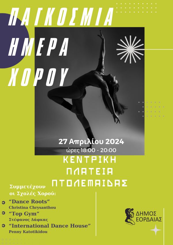 Την Παγκόσμια Ημέρα Χορού, που εορτάζεται στις 29 Απριλίου, γιορτάζει ο Δήμος Εορδαίας, με εκδήλωση που διοργανώνει το απόγευμα του Σαββάτου 27 Απριλίου 2024-αλλά λόγω ότι πέφτει μέσα στην Μεγάλη Εβδομάδα η εκδήλωση θα πραγματοποιηθεί το Σάββατο του Λαζάρου, 27 Απριλίου 2024, στην Κεντρική Πλατεία της Πτολεμαΐδας και ώρα 18.00-20.00.
