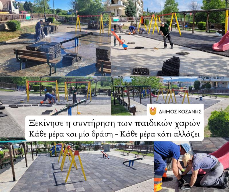 Στόχος του Δήμου Κοζάνης είναι η γρήγορη και αποτελεσματική επισκευή των ζημιών που υπάρχουν στις παιδικές χαρές της πόλης και των χωριών, προκειμένου οι μικροί μας συνδημότες να απολαμβάνουν, ένα όμορφο, λειτουργικό και ασφαλές περιβάλλον ψυχαγωγίας, διασκέδασης και παιχνιδιού.
