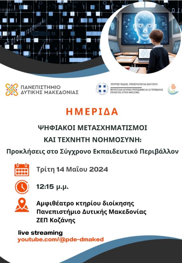 Το Πανεπιστήμιο Δυτικής Μακεδονίας και η Περιφερειακή Διεύθυνση Πρωτοβάθμιας και Δευτεροβάθμιας Εκπαίδευσης συνδιοργανώνουν ημερίδα, με τίτλο : «Ψηφιακοί μετασχηματισμοί και Τεχνητή Νοημοσύνη – Προκλήσεις στο σύγχρονο εκπαιδευτικό περιβάλλον».