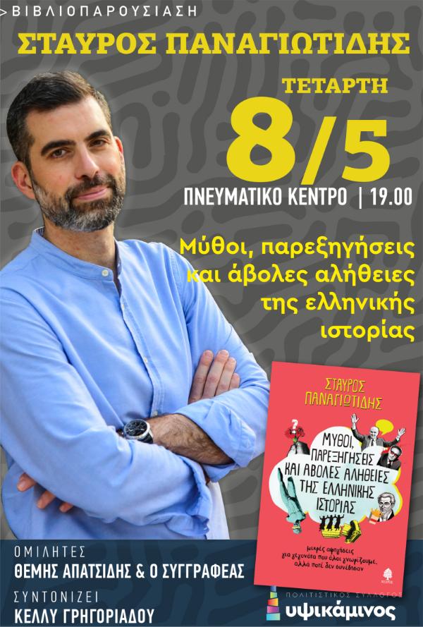 Στο πλαίσιο των εκδηλώσεων της διοργάνωσης Festivalito, ο πολιτιστικός σύλλογος ΥΨΙΚΑΜΙΝΟΣ και οι εκδόσεις ΚΕΔΡΟΣ σας προσκαλούν στην παρουσίαση του βιβλίου του Σταύρου Παναγιωτίδη «Μύθοι, Παρεξηγήσεις και Άβολες Αλήθειες της Ελληνικής Ιστορίας».