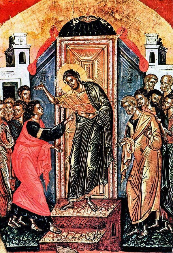 Ωστόσο, απουσιάζει από την πρώτη αναστάσιμη συνάντηση ο Απόστολος Θωμάς. Η δίψα να δει κι εκείνος, να γευτεί την Ανάσταση αγγίζοντας τον Χριστό, υψώνεται ως τείχος απέναντι στον ενθουσιασμό των υπολοίπων δέκα, με την φαινομενική απιστία του, όταν αυτοί του αναφέρουν πως είδαν τον Κύριο. (Ιωαν. 20, 24-26).