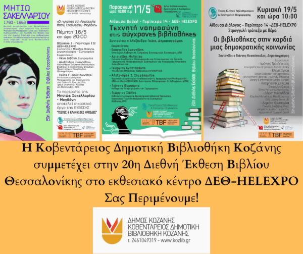 Η Κοβεντάρειος Δημοτική Βιβλιοθήκη Κοζάνης συμμετέχει και φέτος στη Διεθνή Έκθεση Βιβλίου Θεσσαλονίκης στο εκθεσιακό κέντρο ΔΕΘ-HELEXPO και σας προσκαλεί στις δράσεις που οργανώνονται σε συνεργασία με την Ένωση Ελλήνων Βιβλιοθηκονόμων και Επιστημόνων της Πληροφόρησης και το ΠΕΤ Βορείου Ελλάδος, το Τμήμα Βιβλιοθηκονομίας, Αρχειονομίας και Συστημάτων Πληροφόρησης και το Εργαστήριο ΜεταΔΕΔΟΜΕΝΩΝ, Διαχείρισης Πληροφοριών και Δεδομένων του ΔΙΠΑΕ, από την Πέμπτη 16 έως την Κυριακή 19 Μαΐου 2024.
