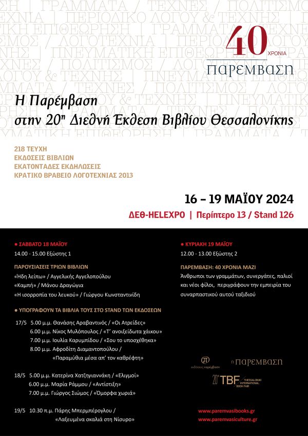 Η ΠΑΡΕΜΒΑΣΗ πρόκειται να λάβει μέρος στην 20η Διεθνή Έκθεση Βιβλίου Θεσσαλονίκης, που θα πραγματοποιηθεί από τις 16 μέχρι τις 19 Μαΐου 2024, με πλούσιο πρόγραμμα εκδηλώσεων. Θα βρίσκεται στο Περίπτερο 13 / Stand 126.