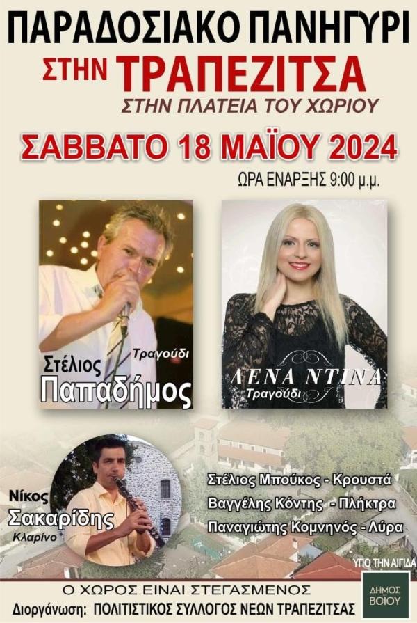 Βόιο 17/05/2024 Δήμος Βοΐου:Παραδοσιακό πανηγύρι στην Τραπεζίτσα 0 Παραδοσιακό πανηγύρι στην Τραπεζίτσα το Σάββατο 18 Μαΐου 2024 στις 9:00μ.μ. στην πλατεία του χωριού.