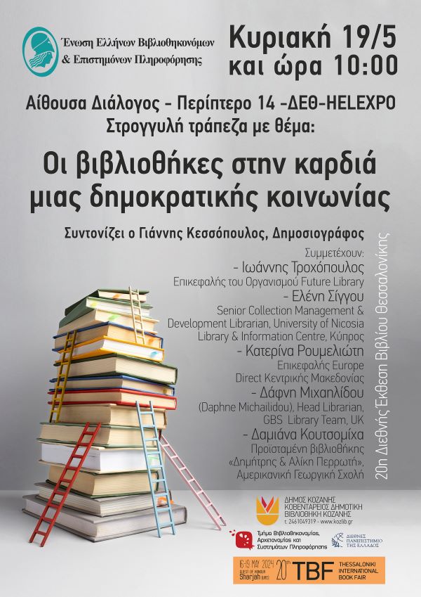 Στο πλαίσιο της 20ης Διεθνούς Έκθεσης Βιβλίου Θεσσαλονίκης, η Κοβεντάρειος Δημοτική Βιβλιοθήκη Κοζάνης σας προσκαλεί στην Στρογγυλή Τράπεζα με θέμα: «Οι βιβλιοθήκες στην καρδιά μιας δημοκρατικής κοινωνίας», την Κυριακή 19 Μαΐου 2024 και ώρα 10:00, στην Αίθουσα Διάλογος – Περίπτερο 14 – ΔΕΘ – HELEXPO.