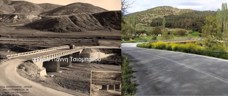 Ένα από αυτά είναι η γέφυρα του Ελασσονίτη ποταμού, σχεδόν ένα χιλιόμετρο πριν την είσοδό μας στη θεσσαλική κωμόπολη. Το γεφύρι αυτό, όπως φαίνεται κι από την πάνω φωτογραφία που τραβήχτηκε λίγο αφού εγκαινιάστηκε, χτίστηκε τη δεκαετία του 1930. Μόλις λοιπόν απέκτησα την παλαιά φωτογραφία και λόγω των συχνών επαγγελματικών μου ταξιδιών στην πρωτεύουσα, υπέκυψα στον πειρασμό, περνώντας τόσο συχνά από το συγκεκριμένο σημείο, για να κάνω έναν υποτυπώδη φωτογραφικό συσχετισμό, παρ’ όλο που αγνοώ βασικές αρχές της φωτογραφίας, (αγωνίζομαι όμως σκληρά για την έννοια της συλλογής).