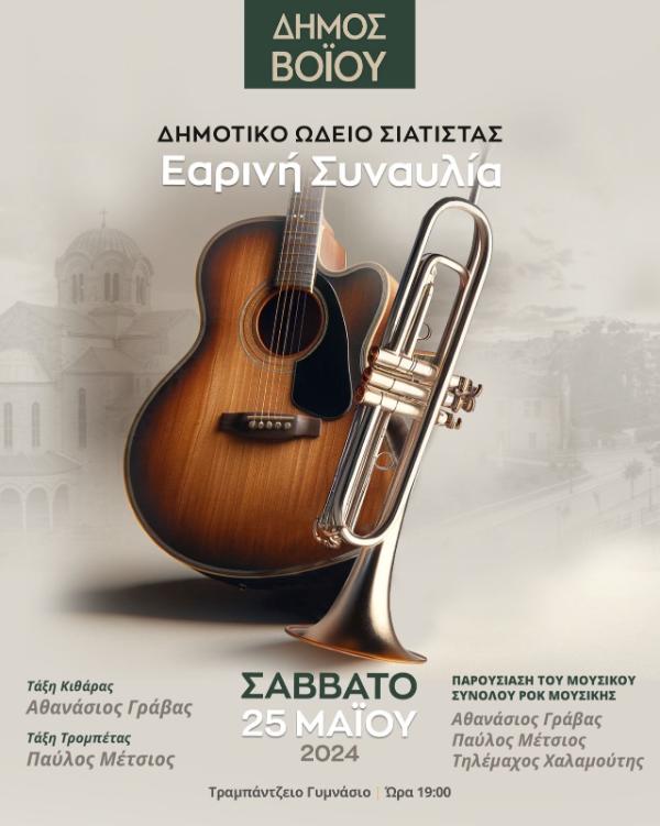 Βόιο 23/05/2024 Εαρινή συναυλία του Δημοτικού Ωδείου Σιάτιστας στο Τραμπάντζειο 0 ΕΑΡΙΝΗ ΣΥΝΑΥΛΙΑ Από το Δημοτικό Ωδείο Σιάτιστας Παρουσίαση του μουσικού συνόλου ροκ μουσικής το Σάββατο 25 Μαΐου 2024 στις 19:00 στο Τραμπάντζειο Γυμνάσιο.