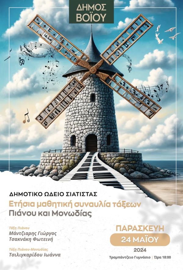 Βόιο 23/05/2024 Ετήσια μαθητική συναυλία τάξεων πιάνου και μονωδίας του Δημοτικού Ωδείου Σιάτιστας 0 Δημοτικό Ωδείο Σιάτιστας Ετήσια μαθητική συναυλία τάξεων πιάνου και μονωδίας Την Παρασκευή 24 Μαΐου 2024 στις 18:00 Στο Τραμπάντζειο Γυμνάσιο