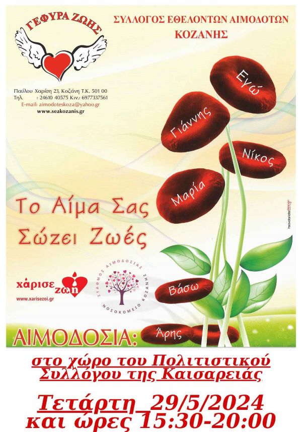 Την Τετάρτη 29 Μαΐου   και ώρα 15:30-20:00 στην Αίθουσα του Μορφωτικού Πολιτιστικού Συλλόγου Καισαρειάς   οργανώνεται  Αιμοδοσία του Σ. Ε. Αιμοδοτών Κοζάνης «ΓΕΦΥΡΑ ΖΩΗΣ» σε συνεργασία με τον Μ.Π.Σ. Καισαρειάς, την Κοινότητα Κήπου Καισαρειάς και το τμήμα Αιμοδοσίας του Μαμάτσειου Γενικού Νοσοκομείου Κοζάνης.