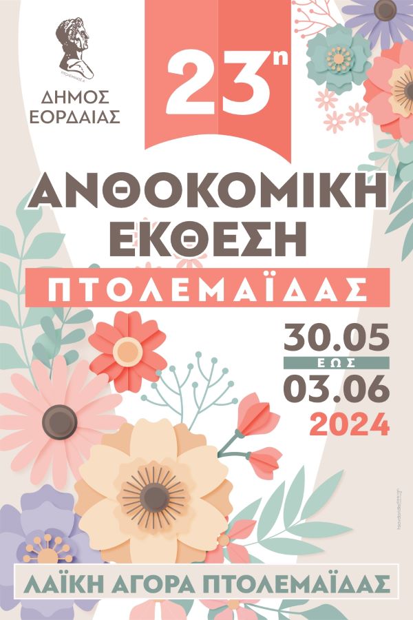 Ο Δήμαρχος και το Δημοτικό Συμβούλιο του Δήμου Εορδαίας σάς προσκαλούν στα εγκαίνια της 23ης Ανθοκομικής Έκθεσης, που θα πραγματοποιηθούν την Πέμπτη 30 Μαΐου 2024 και ώρα 7μ.μ., στο χώρο της Λαϊκής Αγοράς Πτολεμαΐδας.