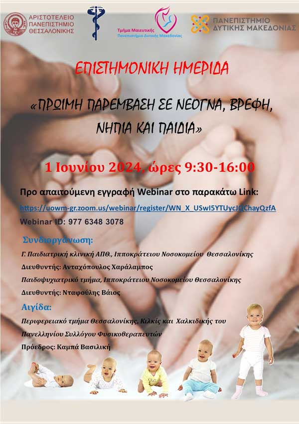 Το Τμήμα Μαιευτικής του Πανεπιστημίου Δυτικής Μακεδονίας σε συνεργασία με τη Γ’ Παιδιατρική Κλινική του Ιπποκράτειου Νοσοκομείου Θεσσαλονίκης και το Παιδοψυχιατρικό Τμήμα του Ιπποκράτειου Νοσοκομείου Θεσσαλονίκης, διοργανώνει επιστημονική ημερίδα με θέμα «Πρώιμη παρέμβαση σε νεογνά, βρέφη, νήπια και παιδιά».