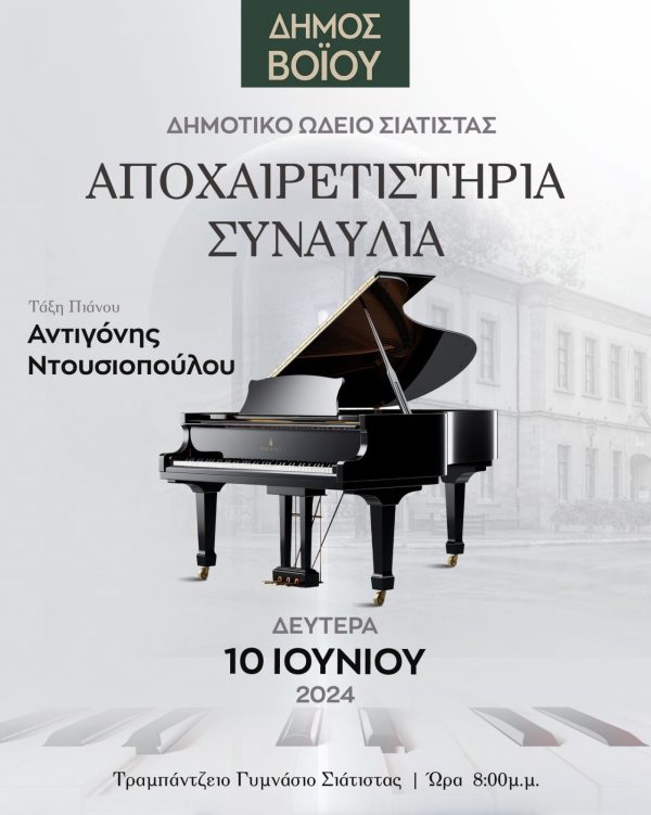 Βόιο 07/06/2024 Αποχαιρετιστήρια συναυλία της τάξης πιάνου του Δημοτικού Ωδείου Σιάτιστας, στις 10/6 0 Την Δευτέρα 10 Ιουνίου 2024 (20:00) στην αίθουσα τελετών του Τραμπαντζείου Γυμνασίου Σιάτιστας, η Τάξη Πιάνου (Καθηγήτρια Αντιγόνη Ντουσιοπούλου) του Δημοτικού Ωδείου Σιάτιστας θα μας δώσει την αποχαιρετιστήρια συναυλία της για την φετινή χρονιά.