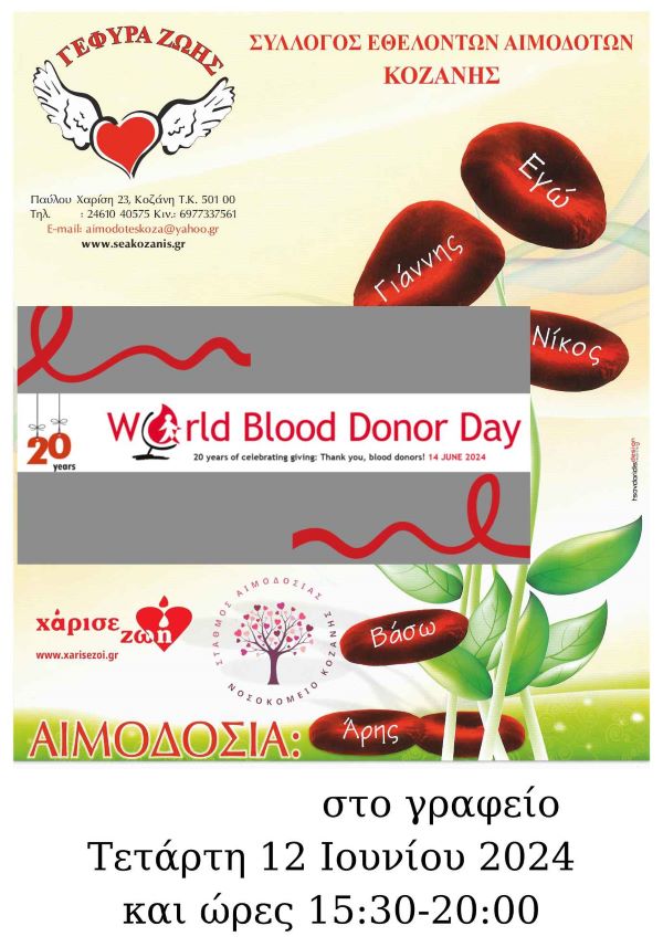 Αιμοδοτούμε 12-6-2024 ημέρα Τετάρτη και ώρες 15:30 – 20:00(προσέλευση μέχρι 19:30) για την Παγκόσμια Ημέρα Εθελοντή Αιμοδότη στο χώρο του συλλόγου, σε συνεργασία με την Αιμοδοσία του Γ.Ν. Κοζάνης.