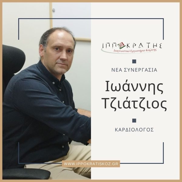 Το Διαγνωστικό Κέντρο «Ιπποκράτης Κοζάνης» είναι στην ευχάριστη θέση να ανακοινώσει τη νέα του συνεργασία με τον Δρ. Ιωάννη Τζιάτζιο. Ο Καρδιολόγος κ. Τζιάτζιος ανέλαβε καθήκοντα από τις 12 Ιουνίου και θα είναι επιφορτισμένος με την απαιτητική και εξειδικευμένη εξέταση της Αναίμακτης Αξονικής Στεφανιογραφίας.