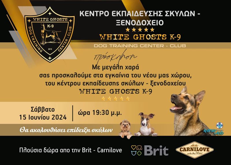 Με μεγάλη μας χαρά σας καλούμε όλους στα επίσημα εγκαίνια της μονάδας μας Κέντρο Εκπαίδευσης Σκύλων και Ξενοδοχείο White Ghosts K9 πού θα πραγματοποιηθούν το Σάββατο 15 Ιουνίου και ώρα 19:30 το απόγευμα!