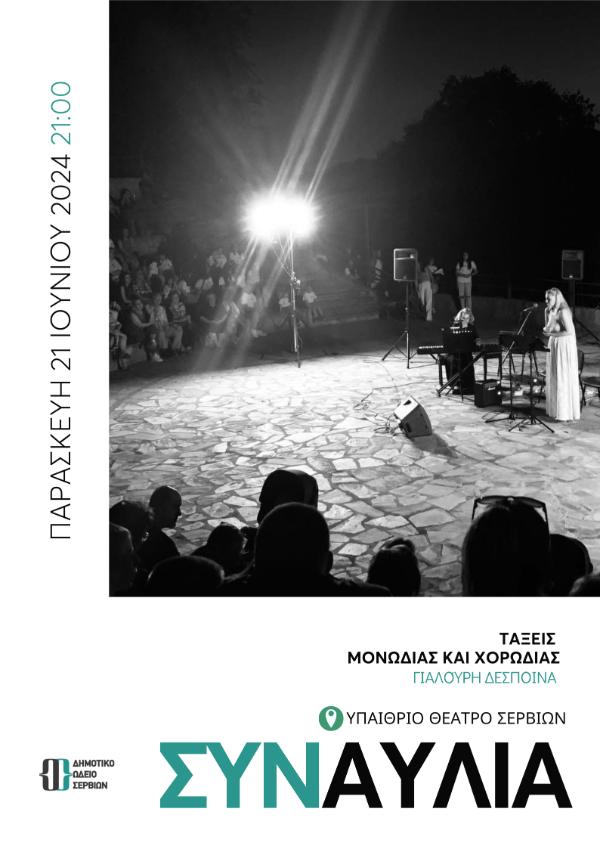 Ο Δήμος Σερβίων και το Δημοτικό Ωδείο Σερβίων έχουν τη χαρά να σας προσκαλέσουν στη συναυλία των τάξεων, μονωδίας και χορωδίας. Η συναυλία θα πραγματοποιηθεί την Παρασκευή, 21 Ιουνίου 2024, στο υπαίθριο θέατρο Σερβίων, στις 21:00.