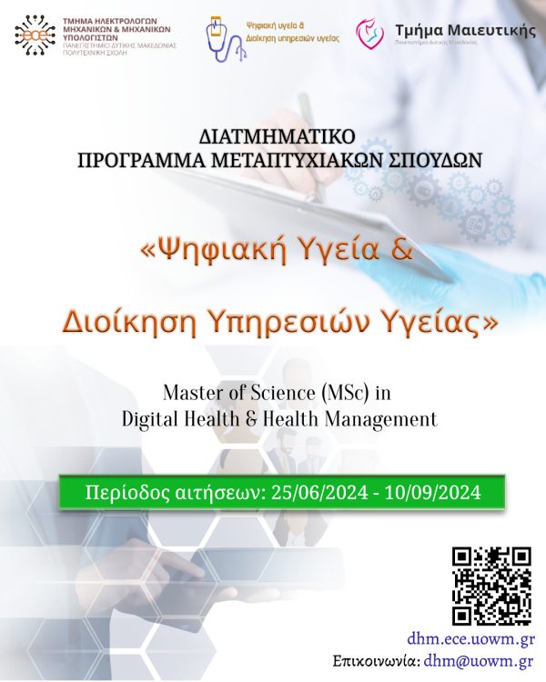 Τα τμήματα Ηλεκτρολόγων Μηχανικών και Μηχανικών Υπολογιστών και Μαιευτικής του Πανεπιστημίου Δυτικής Μακεδονίας καλούν τους ενδιαφερόμενους να υποβάλουν υποψηφιότητα για την παρακολούθηση του εγκεκριμένου Προγράμματος Μεταπτυχιακών Σπουδών το οποίο οδηγεί στην απονομή ΔΙπλώματος ΜεταπτυχΙακών Σπουδών (ΔΜΣ-Master) «ΨηφΙακή Υγεία & ΔΙΟίκηση ΥπηρεσΙών Υγείας (Digital Health & Health Management)»