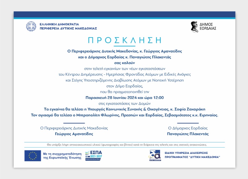 Τα εγκαίνια του Κέντρου Διημέρευσης- Ημερήσιας Φροντίδας Ατόμων με Ειδικές Ανάγκες και Στέγης Υποστηριζόμενης Διαβίωσης Ατόμων με Νοητική Υστέρηση στο Δήμο Εορδαίας, τελούν η Περιφέρεια Δυτικής Μακεδονίας και ο Δήμος Εορδαίας την Παρασκευή 28 Ιουνίου 2024 και ώρα 12.00.