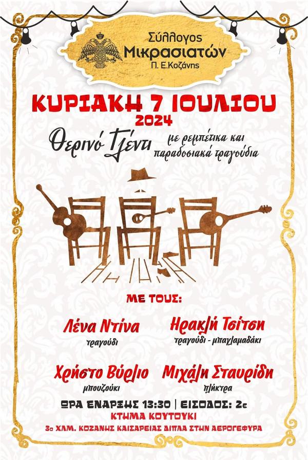 Κοζάνη 26/06/2024 Θερινό γλέντι με ρεμπέτικα και παραδοσιακά τραγούδια διοργανώνει ο Σύλλογος Μικρασιατών Κοζάνης 0 Ευκαιρία να γλεντήσουμε όλοι μαζί, πριν “σκορπίσουμε” θερινά. Το μεσημέρι της Κυριακής στις 07.07.24, στο “Κτήμα Κουτούκι, θα χορέψουμε και θα τραγουδήσουμε ρεμπέτικα, μικρασιάτικα κι άλλα παραδοσιακά. Είστε όλοι ευπρόσδεκτοι!