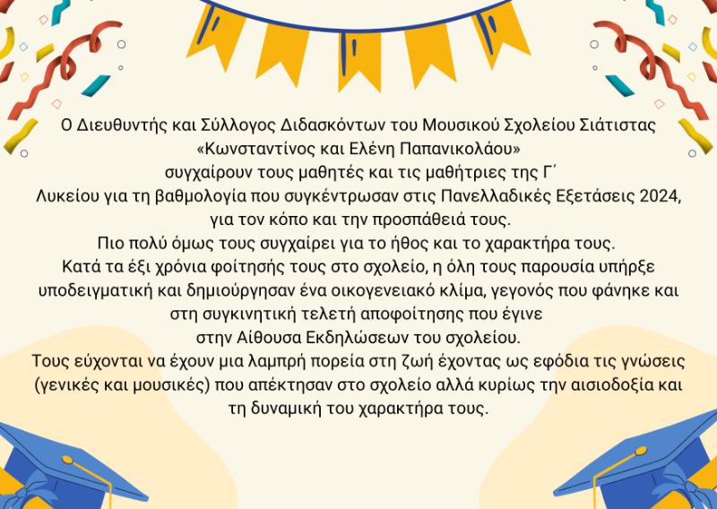 Ο Διευθυντής και Σύλλογος Διδασκόντων του Μουσικού Σχολείου Σιάτιστας «Κωνσταντίνος και Ελένη Παπανικολάου» συγχαίρουν τους μαθητές και τις μαθήτριες της Γ Λυκείου για τη βαθμολογία που συγκέντρωσαν στις Πανελλαδικές Εξετάσεις 2024, για τον κόπο και την προσπάθειά τους.