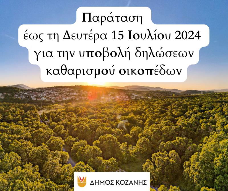 Ο Δήμος Κοζάνης ενημερώνει τους πολίτες ότι σύμφωνα με ανακοίνωση του Υπουργείου Κλιματικής Κρίσης και Πολιτικής Προστασίας, η ψηφιακή πλατφόρμα δήλωσης καθαρισμού οικοπέδων, στην οποία οι πολίτες πρέπει να εισέρχονται ώστε να υποβάλλουν τις υπεύθυνες δηλώσεις τους στη διεύθυνση https://akatharista.apps.gov.gr/, θα παραμείνει ανοιχτή έως τη Δευτέρα 15 Ιουλίου 2024.